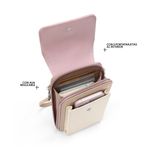Portatodo Chio, material tipo cuero con asa regulable, cuenta con un bolsillo frontal y color block.
